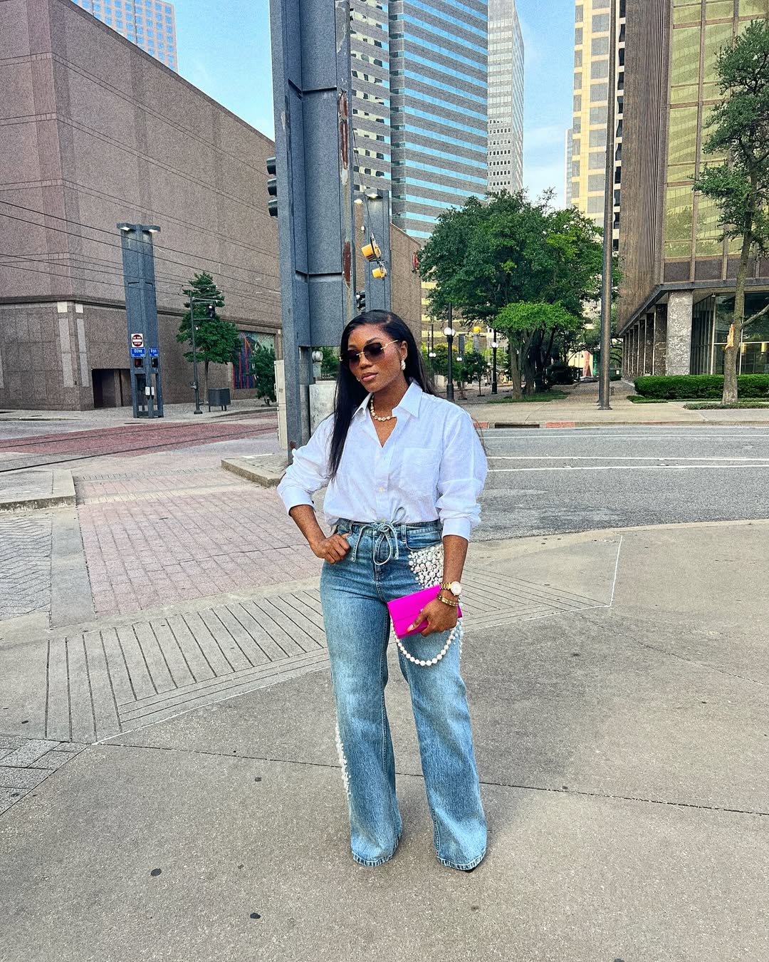There’s something effortlessly polished about pairing light-wash denim with a crisp white top. Whether it’s an oversized button-down, a relaxed cotton blouse or a sleek, structured shirt, the combination always feels fresh. Complete the outfit with white sneakers and a simple white bag to effortlessly double up.