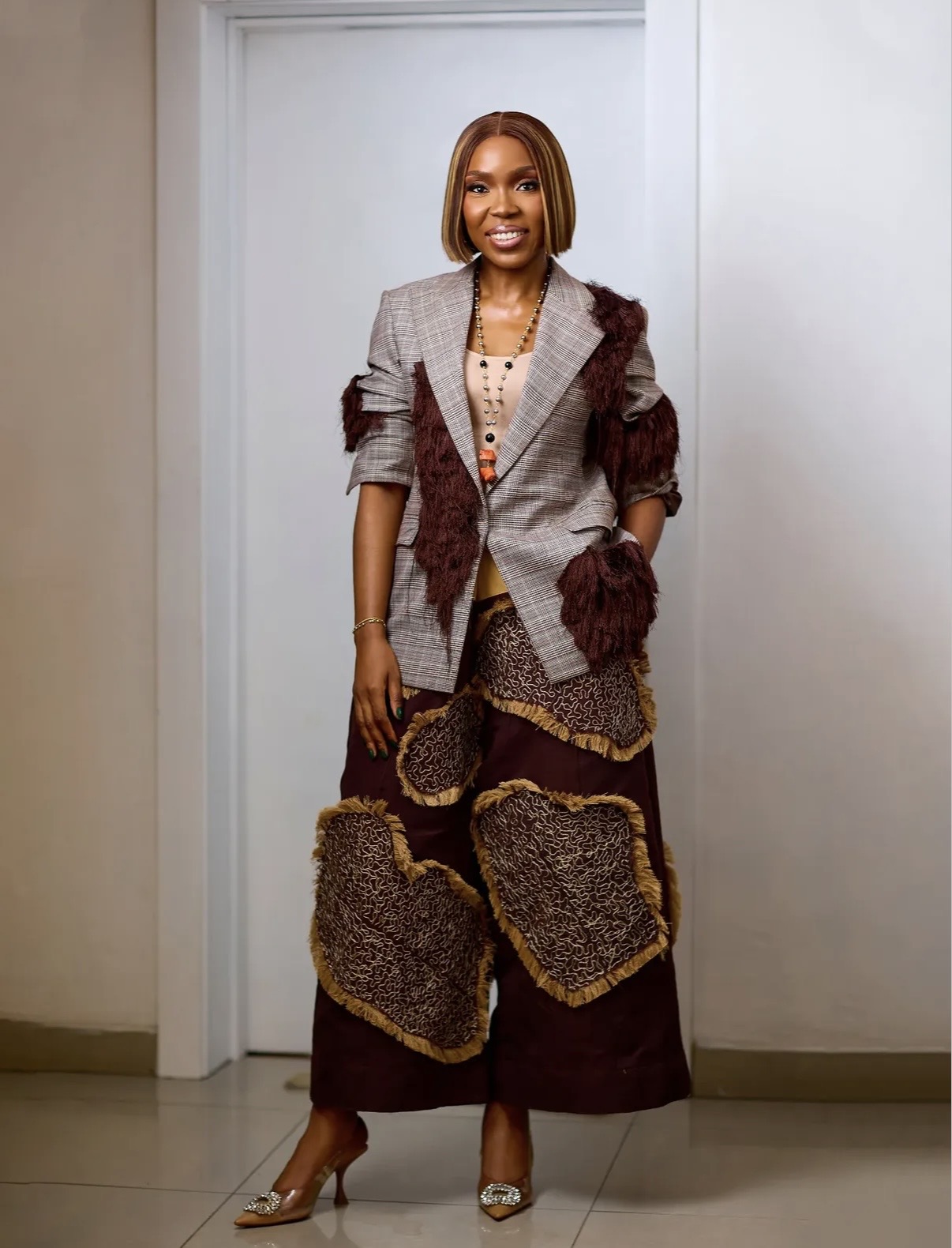 Lala Akindoju tended towards experimentation, combining customization with artisanal textures in a directional way. Her layered approach combined contrasting elements to create a rich, multi-dimensional look.