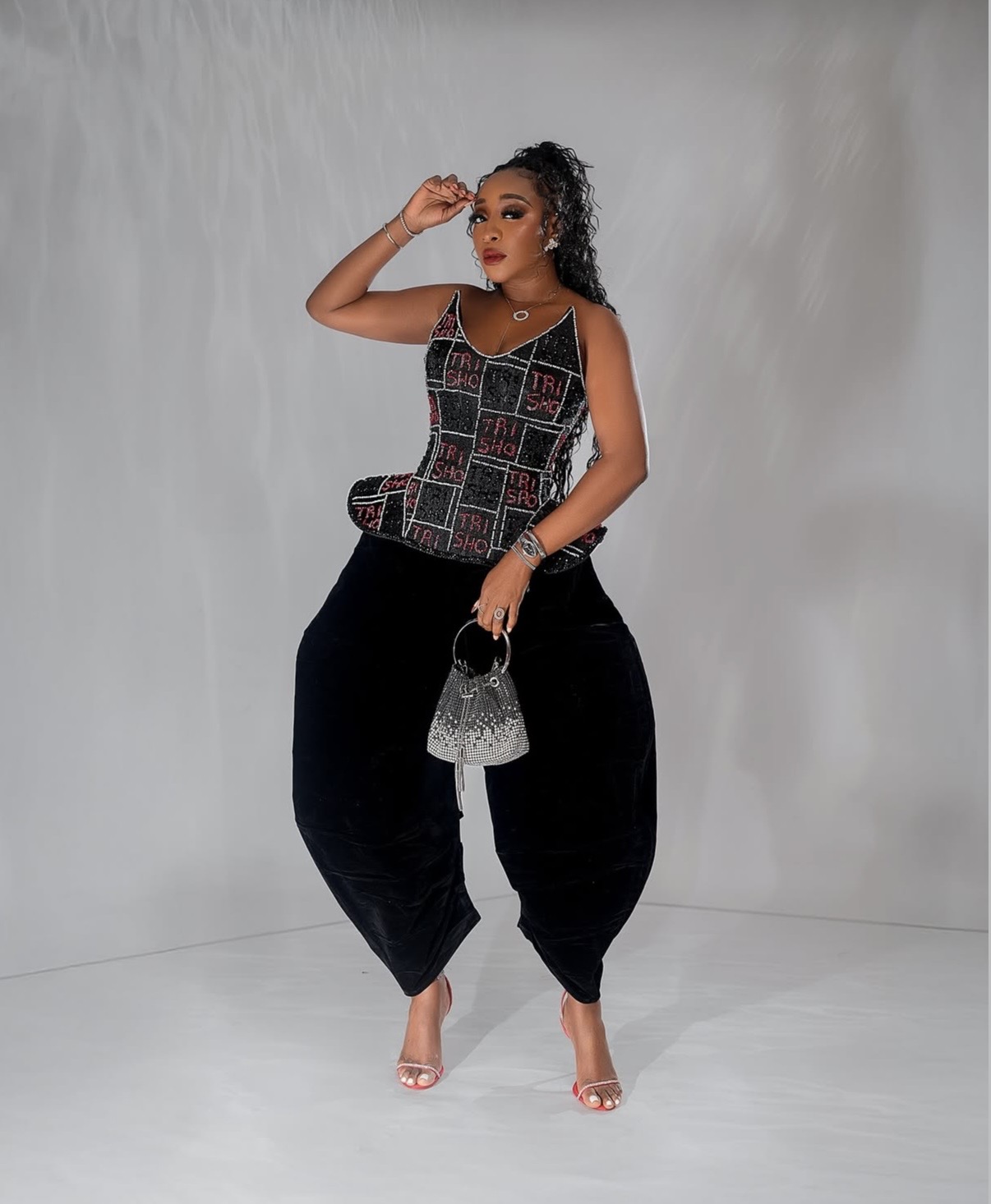 Ini Edo provided a high-fashion moment rooted in volume and contrast. Her corset top made a sharp, embellished focal point, drawing the eye upward before giving way to the exaggerated proportions of her balloon pants.