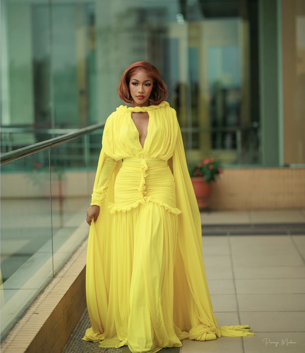 Hawa Magaji embraced color with confidence, stepping out in a bright yellow dress that exuded a strong visual presence. The flowing fabric introduced softness, while the detailed center section added depth and structure.