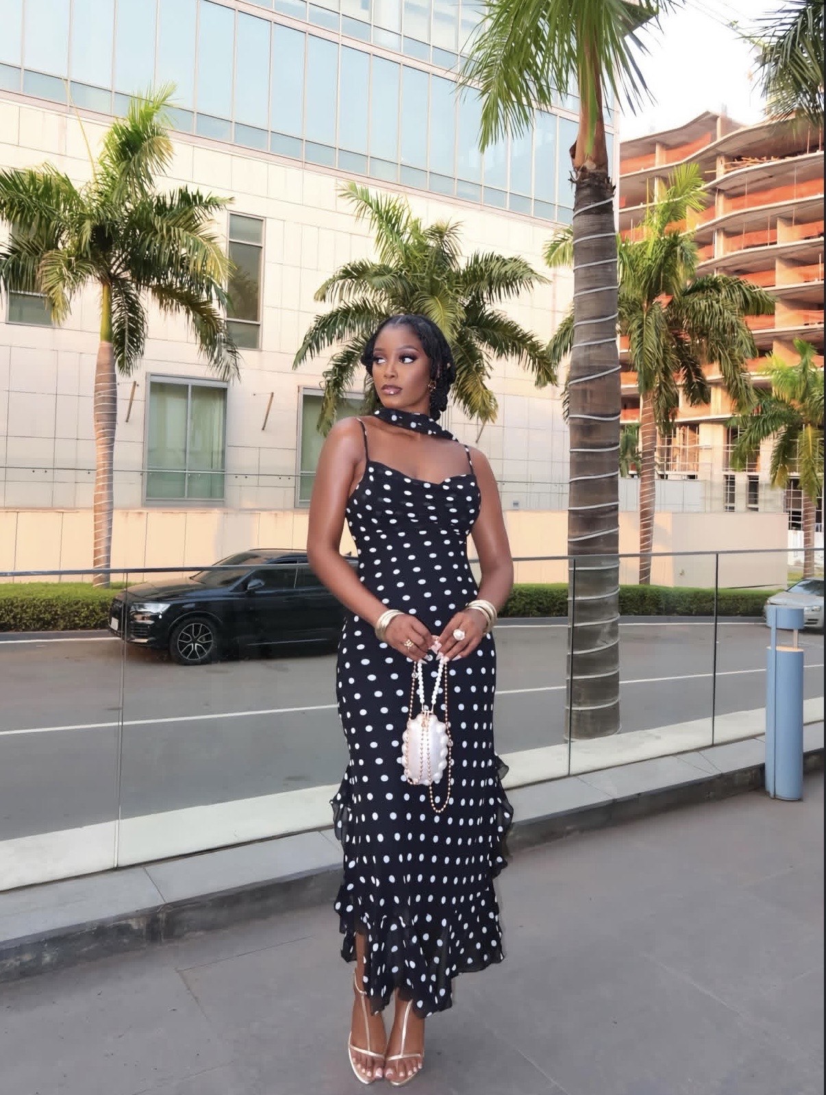 A layered ruffled hem added movement, making the look a low-key performance. A matching choker scarf and white beaded handbag added cohesion, while gold bracelets and metallic heels completed the final look.