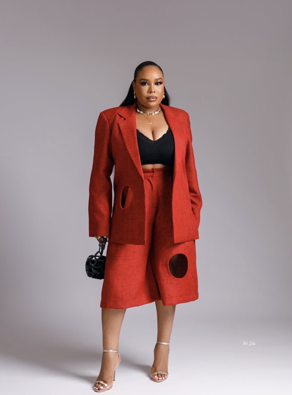 Mimi Onalaja stepped out in a custom red set that reimagined power dressing with playful precision. Round cutouts on the blazer and culotte-style shorts introduced an unexpected geometry, giving the look a contemporary edge. A black crop top underneath added balance and structure.