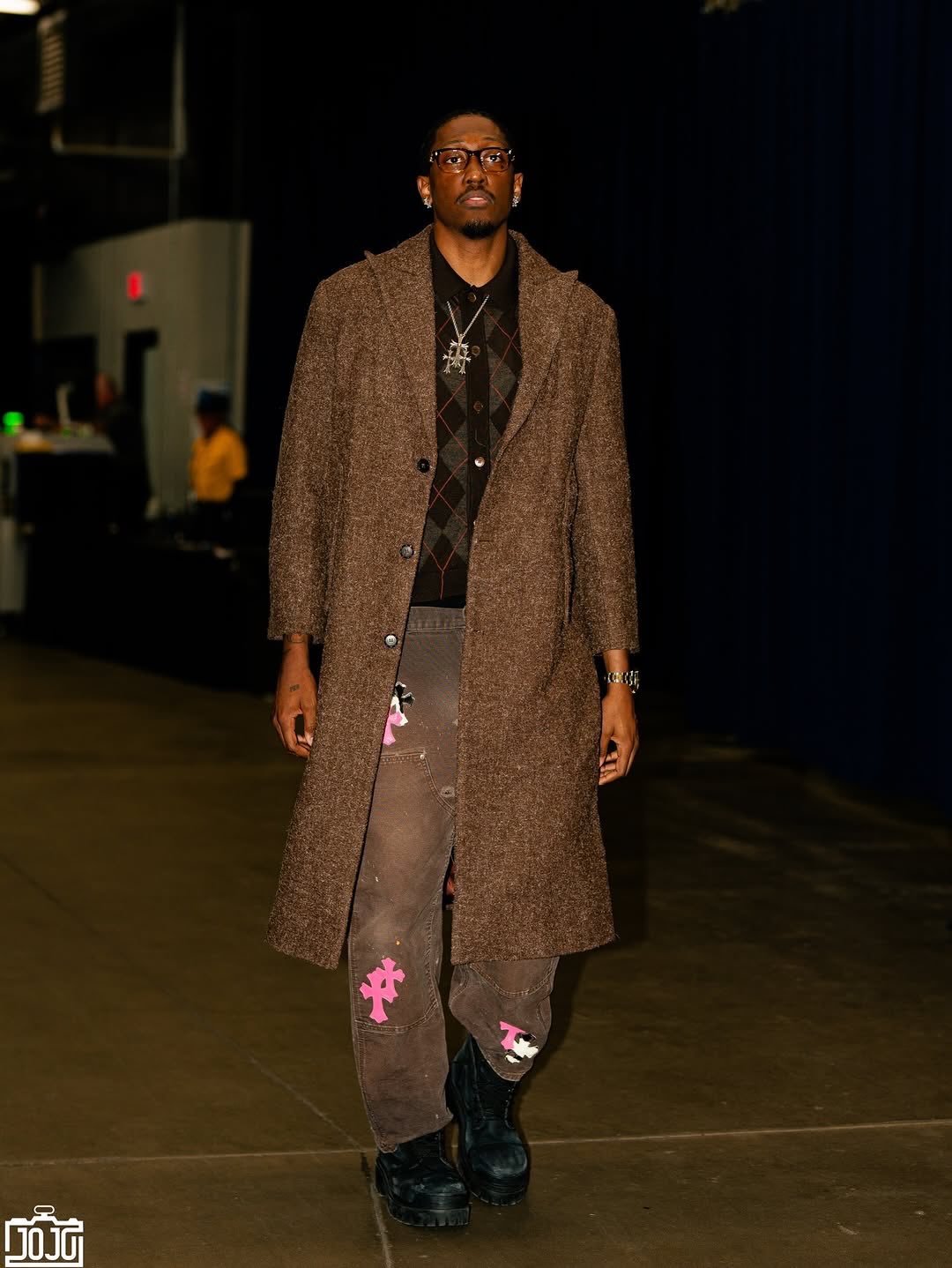 Court side, Russell Westbrook continued to refine his personal style through his label Honor The Gift. When he attended the Sacramento Kings-Toronto Raptors game, he opted for a coordinating brown two-piece set that balanced comfort with thoughtful details. The zip-up jacket and relaxed trousers featured a floral pattern of small white blossoms, which added texture without overwhelming the look. Underneath, a simple white undershirt and thin necklace peeked through the open collar, while crisp white sneakers kept the outfit fresh and grounded. Finished off with a matching cap and watch, it felt understated yet considered.
