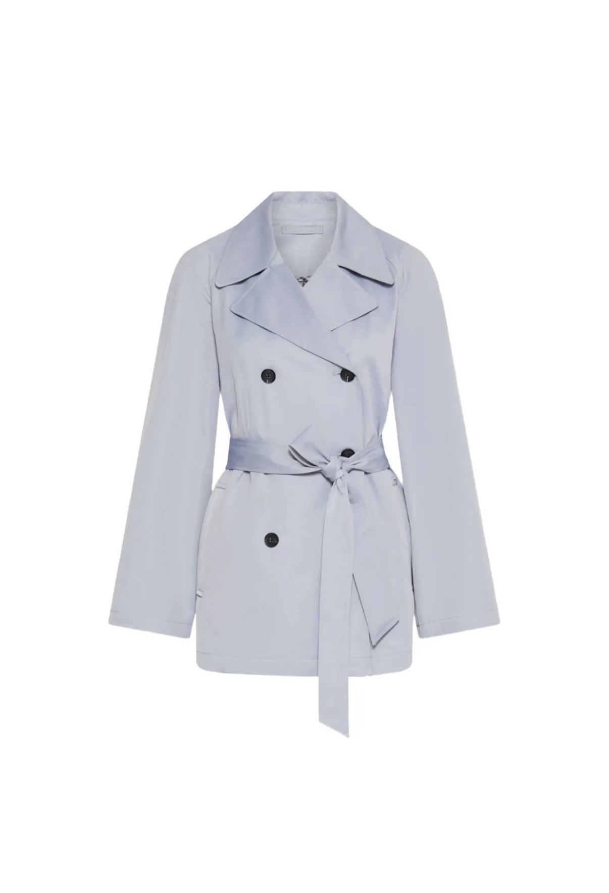 The lightweight construction gives this trench-inspired jacket its appeal. The light blue hue provides a fresh seasonal feel, while the double-breasted buttons and belt maintain the recognizable structure of the trench coat silhouette. Notch lapels and long sleeves add further sophistication, creating a garment that feels polished yet easy to wear.