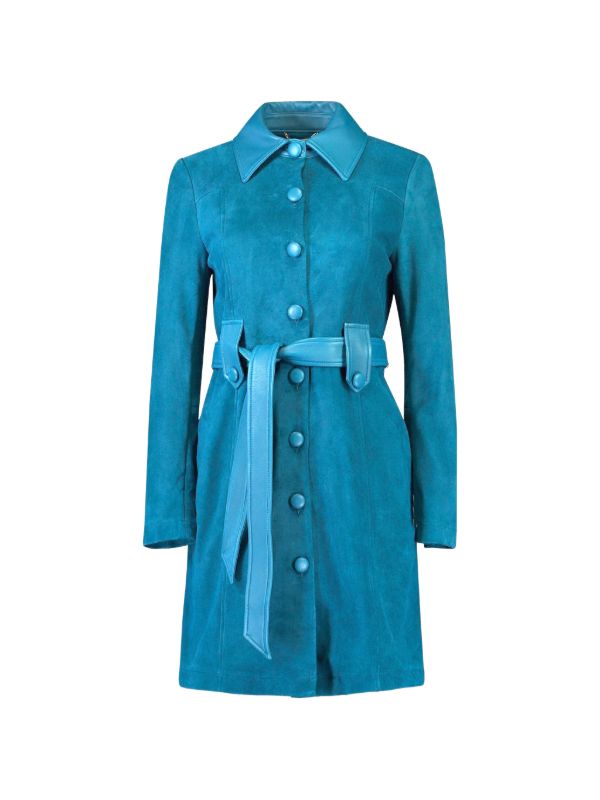 Texture becomes the striking element in this design. Crafted from 100% calf suede, the jacket introduces a rich surface that immediately elevates the classic belted silhouette. The peacock blue shade adds even more depth and offers a sophisticated alternative to more traditional trench coat materials.